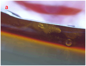 在检测中应对带皮琥珀要更加警惕仔细观察,这类“贴皮”琥珀的主要鉴别要点是显微镜下观察与紫外荧光灯下观察相结合。俏色部分侧面观察时,应关注颜色变化有无过渡,是否存在粘合痕迹(粘接处结合不紧密以及残留的浑圆状气泡等)。充填部分的观察应结合镜下以及紫外荧光灯下荧光颜色及强度差异的观察。